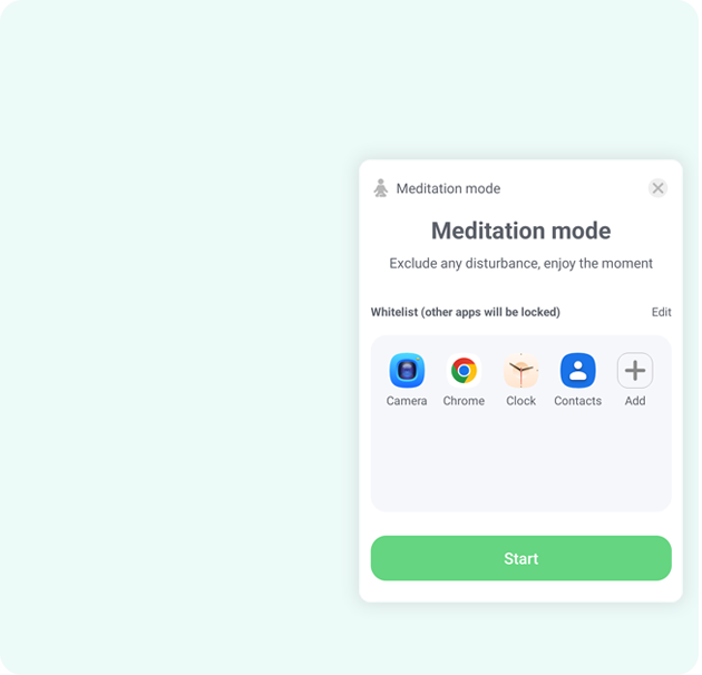Добавьте приложения, которые Вы желаете использовать во время медитации, не включенные в данный список будут заблокированы, пока режим активен.